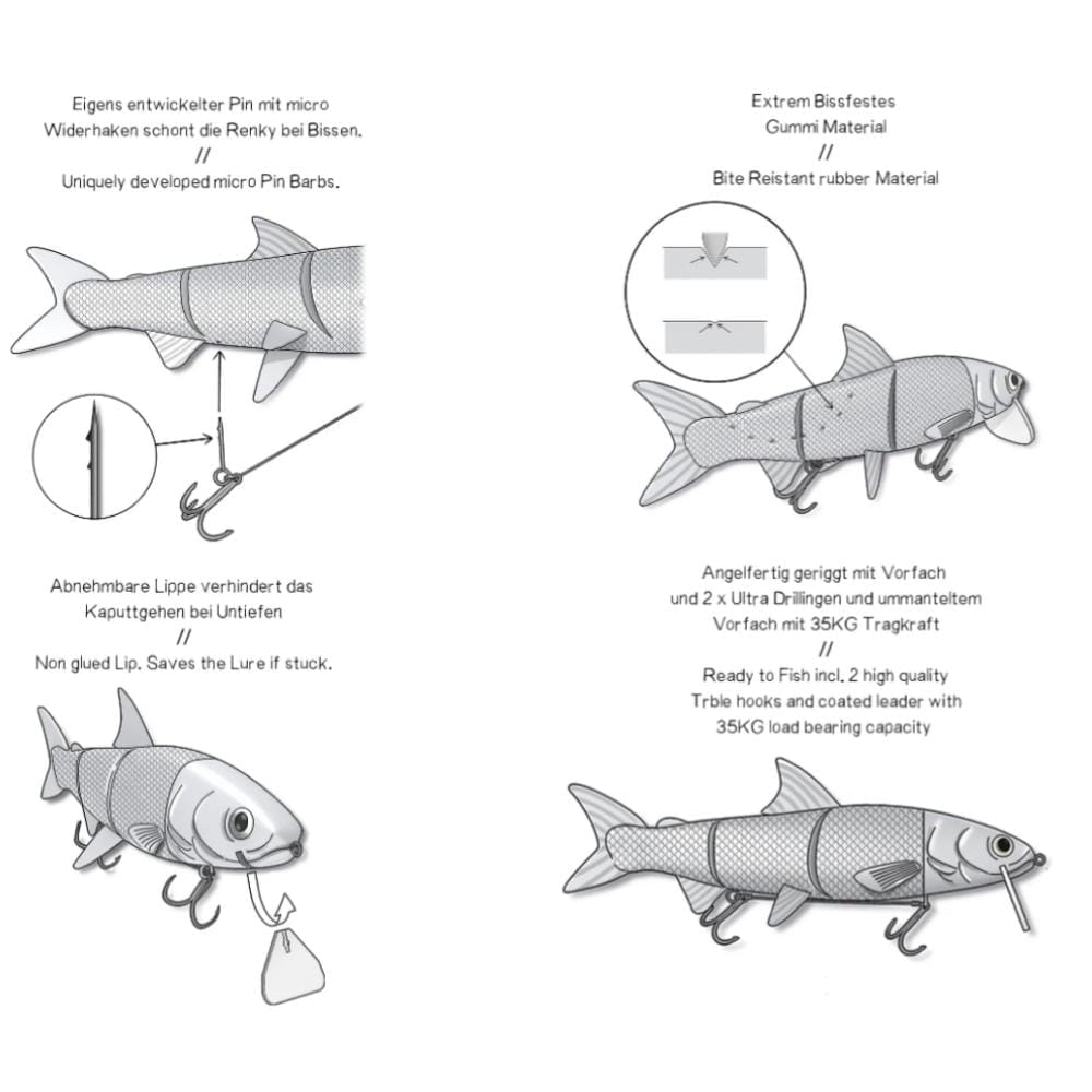 Der Köder kommt komplett angel-fertig, mit ummanteltem Vorfach (ca. 35 kg Tragkraft), 2 robusten und scharfen Drillingen sowie einer zweiten Ersatzlippe. Der hintere Drilling ist eine Nummer kleiner als der Vordere und beeinflusst das Schwimmverhalten positiv.Bei einem Biss kann der hintere Haken aus dem Köder gleiten und immer wieder durch das FishingGhost Pin-System materialschonend zurückgesteckt werden.