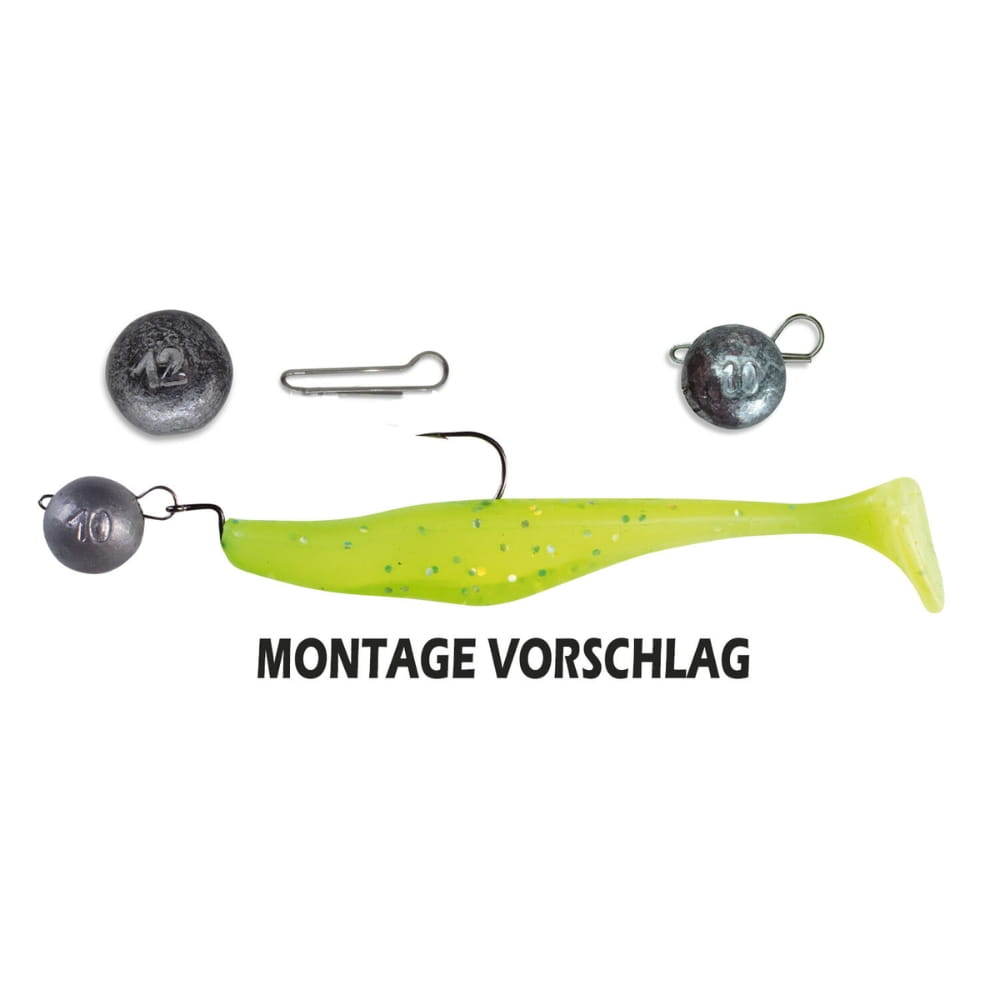 - Leicht und schnell auswechselbare Gewichte, ohne den Köder zu beschädigen, da Haken im Köder verbleibt