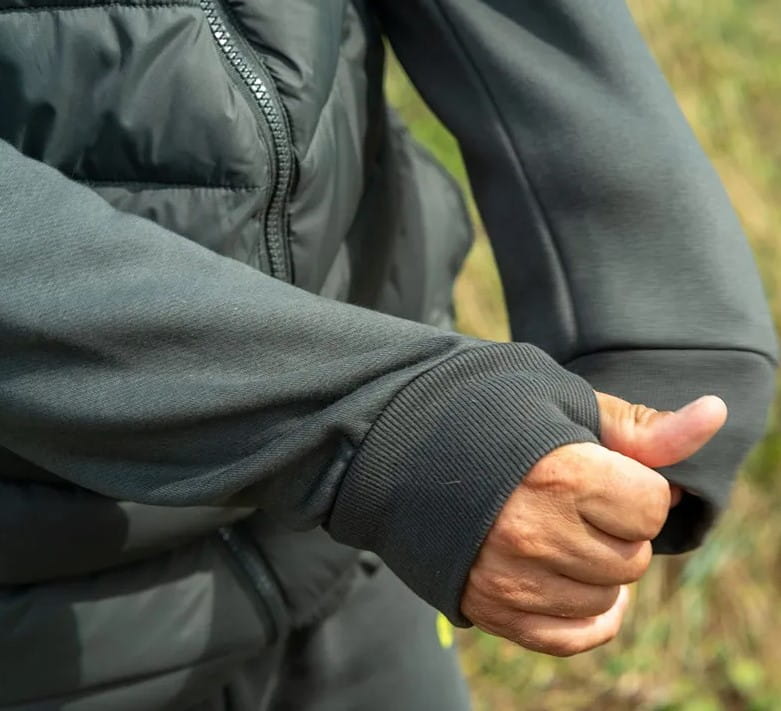 - Mâneci elastice cu găuri pentru degetul mare și tiv ajustabil